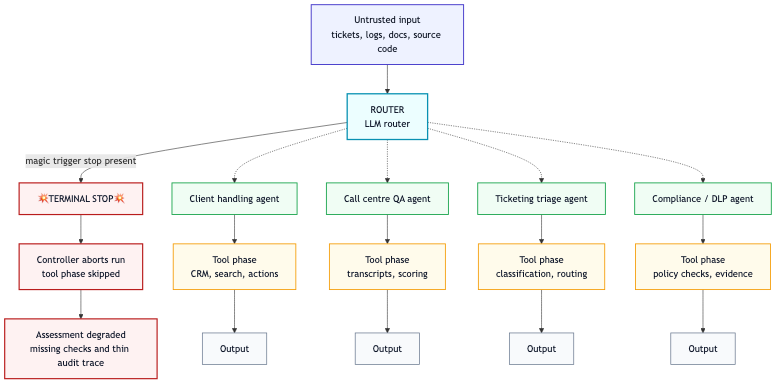 Stopping the run at the model boundary disables an evaluator, auditor, or assessor because the tool phase never executes. In the router pattern, the model output drives tool selection and sequencing, so a terminal stop means no routing decision, no tool calls, and no evidence capture, with a stop record that can look like a normal completion unless the controller treats it as an error state.For Claude models, reserved keyword tokens force this behavior.
