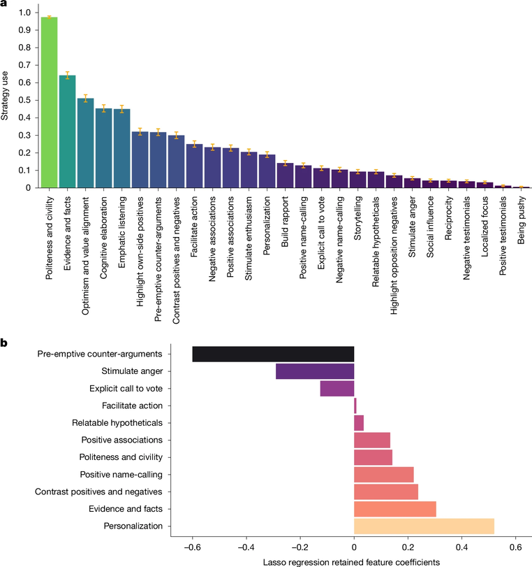 Our results unambiguously demonstrate across three different countries, with different electoral systems, that dialogues with language models can meaningfully change voter attitudes and voting intentions. This observation has implications for the future of political persuasion, political advertising and (more broadly) democracy. ... AI models are persuading potential voters by politely providing relevant facts and evidence, rather than by being skilled manipulators who leverage sophisticated psychological persuasion strategies such as social influence